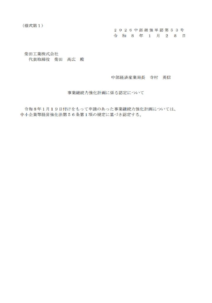その取り組みが評価され、このたび「事業継続力強化計画」の認定を受けました。