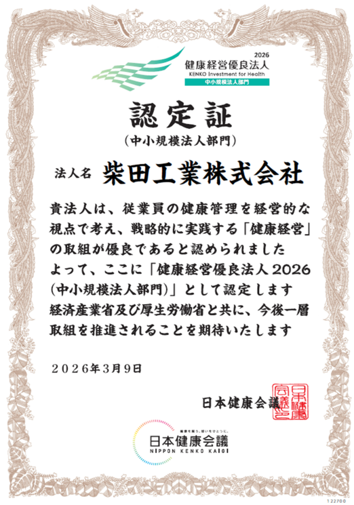 従業員の健康管理に対する取り組みが認められ、認定証をいただきました。